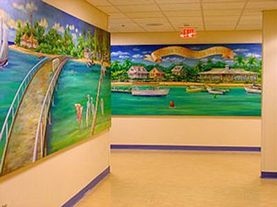 Sissi Janku, a Sanibel artist known for her colorful tropical seascapes, teamed up with Sanibel Cares to create artwork for the new children's oncology unit at the Health Park. The theme of the paintings are a whimsical boat ride with children around Sanibel Island. After extensive research, sketches and meetings, it was decided to do seven mural-sized paintings and eight smaller paintings that have the look and shape of portholes.